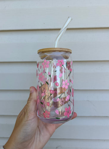 Pink Floral 16 oz Glass Can Cup